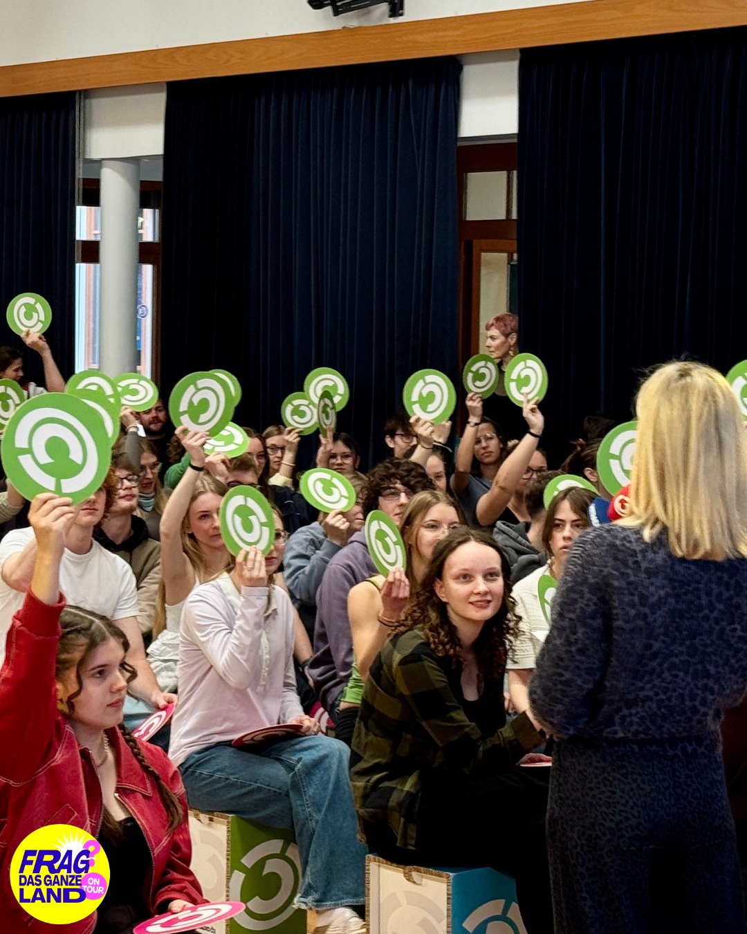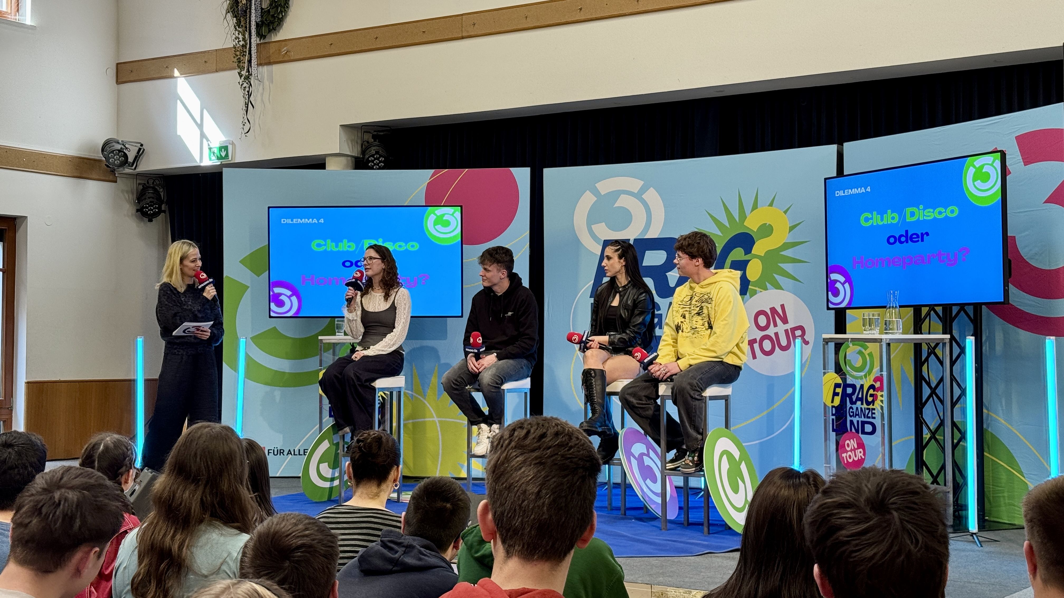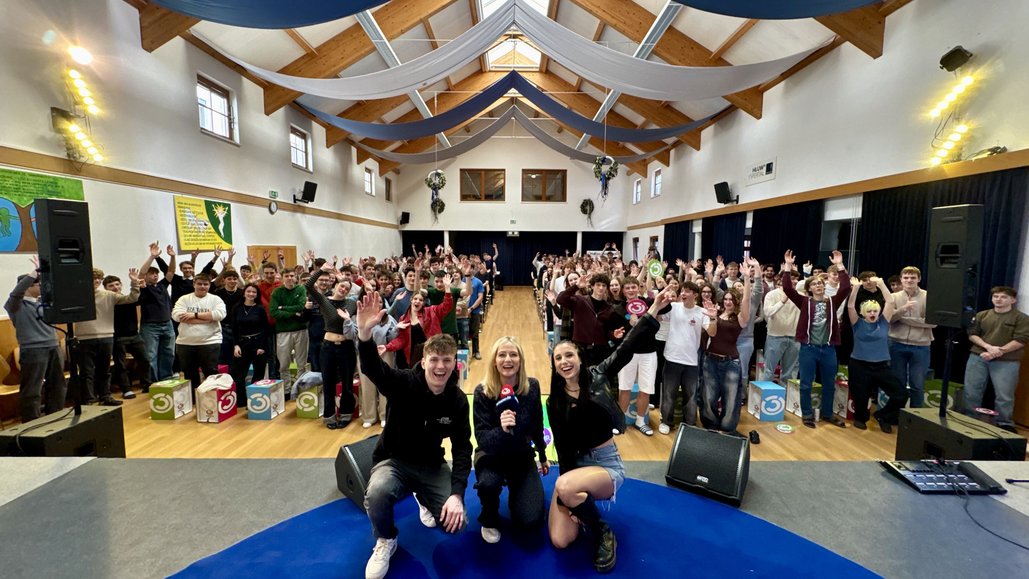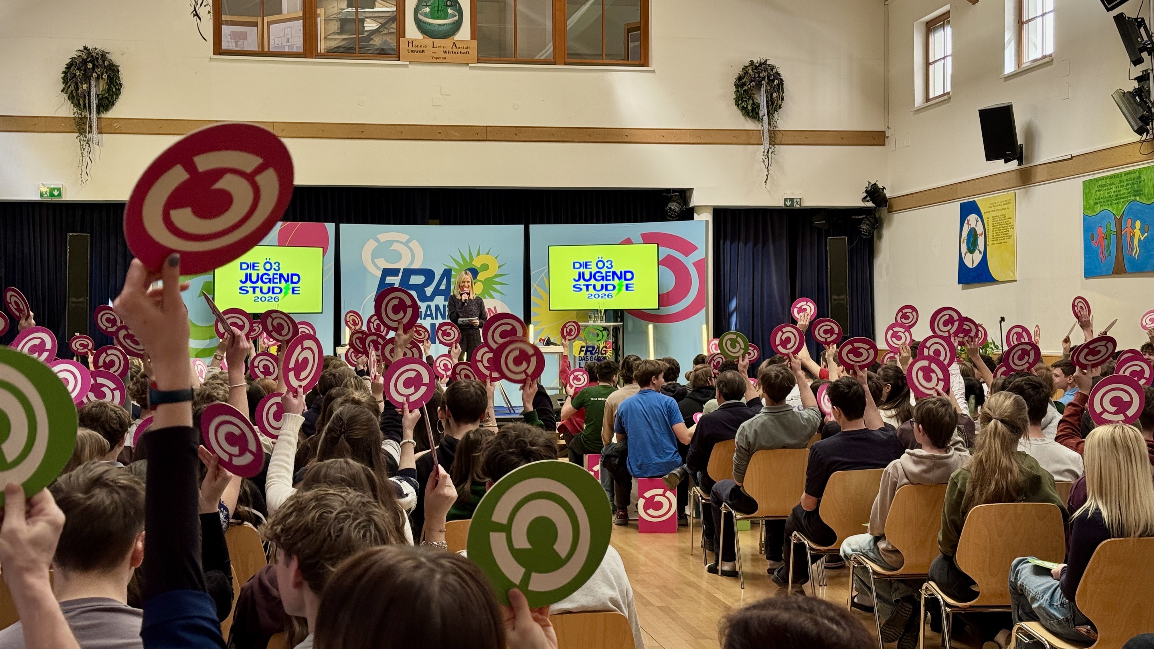 Basierend auf der Ö3 Jugendstudie wurden Themen diskutiert, die für Jugendliche wichtig sind. Jede Meinung durfte gesagt werden. Es wurde auch Blitzerhebungen der Meinung aller Anwesenden mit bunten Ö3 Logos gemacht.